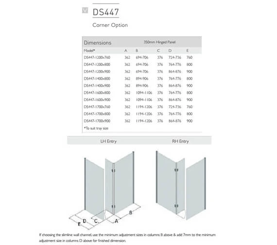 The Aqata Design DS447 Left-Hand Entry Corner Walk-In Enclosure with 350mm Hinged Panel is a chic and high-quality unit available for purchase in various sizes left-hand and right-hand variations and coated in one of several possible glass finish options. Suitable for use with a power shower and designed for tray or wet room installation, this model also offers 12mm of built-in wall adjustment to ensure its compatibility within nearly any size shower enclosure. Boasting an overall height of 2030mm when the included steady bar is fitted, this product does not include the , waste or towel rail shown in the accompanying image.