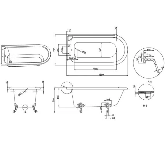 - Displaced capacity for 1500mm Bath: 105 litres.