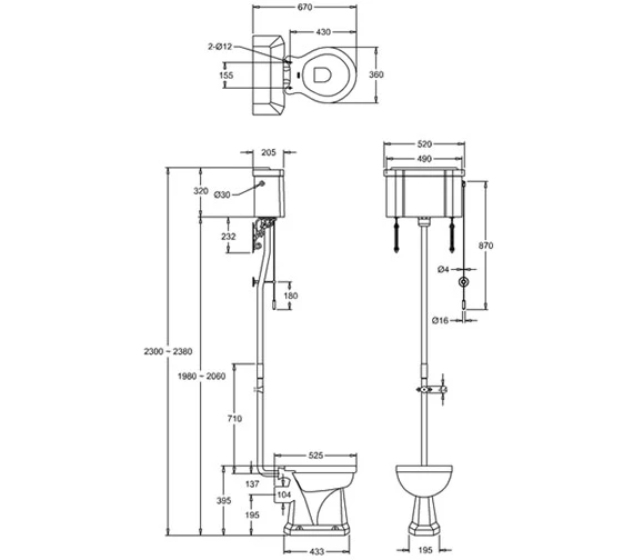 - Includes: P2 – Low/High-Level Pan, C5 – High-Level Cistern including Cistern Fittings, T30 – High-Level Flush Pipe kit including Lever, Rigid pull chain, Flush pipes, Reverse screw cistern connector, Stopper and Ornate brackets.