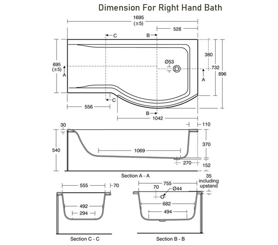 - Size is – Length 1695mm x Width 732-695mm x Depth 370mm.