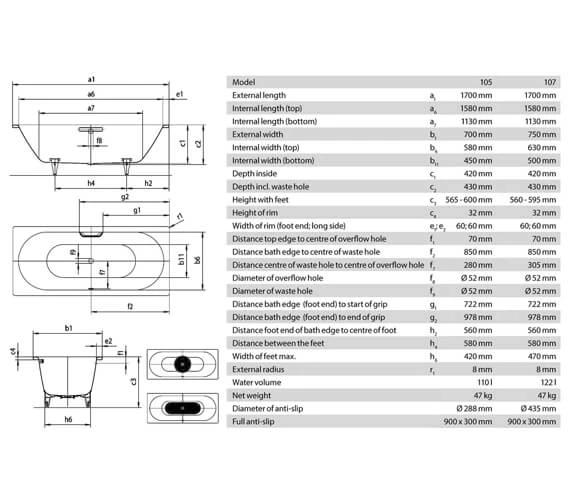 - Water capacity: 700mm width 110 litres and 750mm width 122 litres.