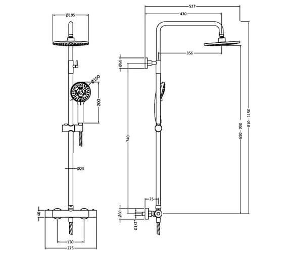 Nuie Round Chrome Thermostatic Bar Valve With Telescopic Kit And Handset