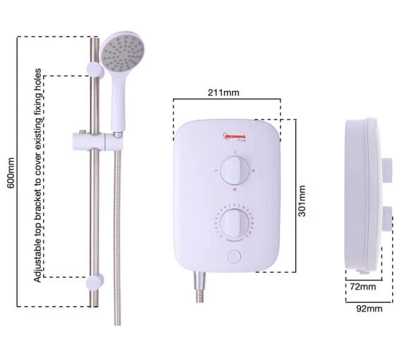 Add sheer simplicity to any shower space both modern and traditional with the Redring Pure 7.5kW Instantaneous Electric Shower. The electric shower kit ensures ease of use both when turning it on and when adjusting the temperature of the water with excellent precision. It enables instant water heating and comes out of the single-mode showerhead with the perfect level of pressure. It sits on a 600-millimetre-tall shower riser, while the electric unit box measures a size of 211 millimetres in width by 92 millimetres in depth by 301 millimetres in height.