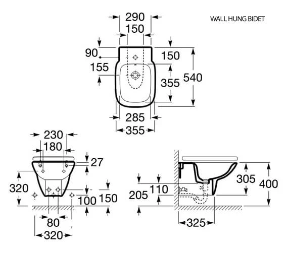 - Size of wall hung bidet: Width 355mm x Depth (Projection) 540mm x Height 305mm.