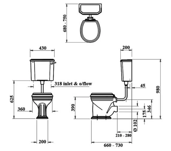 - Size of cistern: Width 430mm x Depth 200mm x Height 355mm.