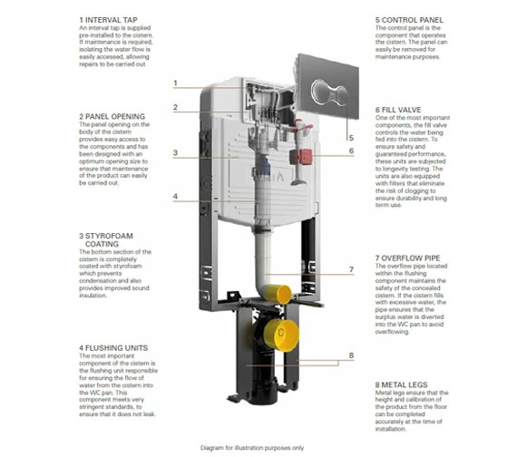 Water Saving – The dual flush action for the 12cm concealed cisterns operate at